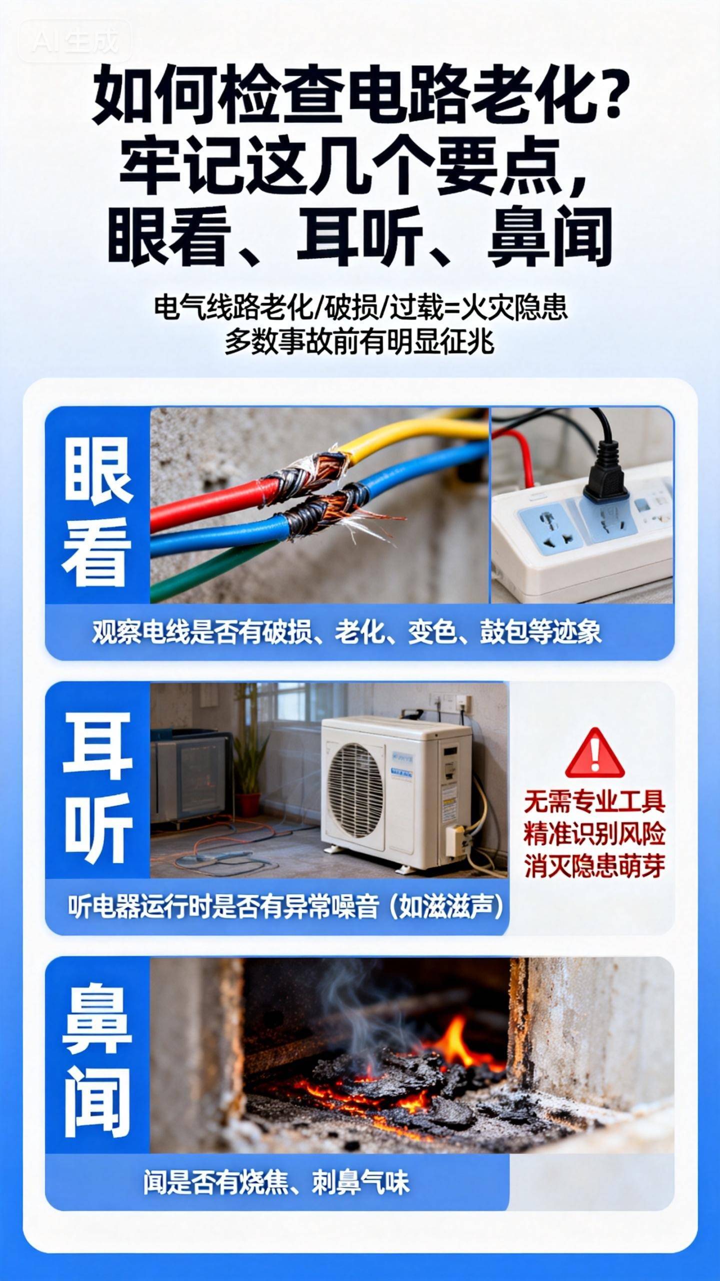 湖北日报讯(记者童晨曦、通讯员吴祯祯)天气逐渐寒冷,家庭用电增加,您家的电路扛得住吗?过载、老化可能正在“埋雷”。消防部门提醒:学会眼看、耳听、鼻闻三招,自己就能揪出隐患。