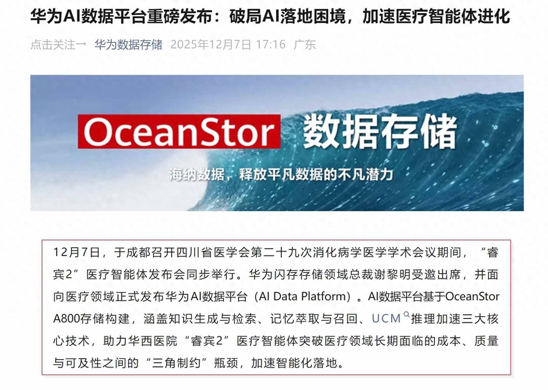 智通财经APP获悉,据“华为数据存储”12月7日消息,华为面向医疗领域正式发布华为AI数据平台(AI Data Platform)。AI数据平台基于OceanStor A800存储构建,涵盖知识生成与检索、记忆萃取与召回、UCM推理加速三大核心技术,助力华西医院“睿宾2”医疗智能体突破医疗领域长期面临的成本、质量与可及性之间的“三角制约”瓶颈,加速智能化落地。