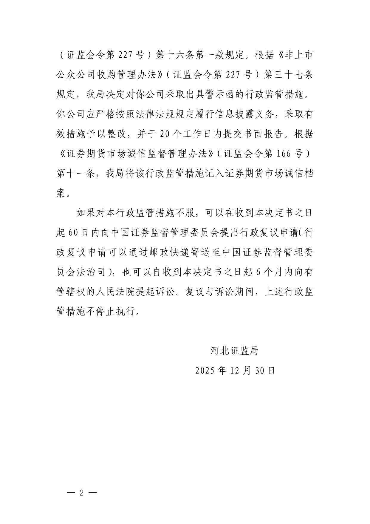 上述行为违反了《非上市公众公司收购管理办法》的规定。河北证监局决定对河北惠华房地产开发有限公司采取出具警示函的行政监管措施。
