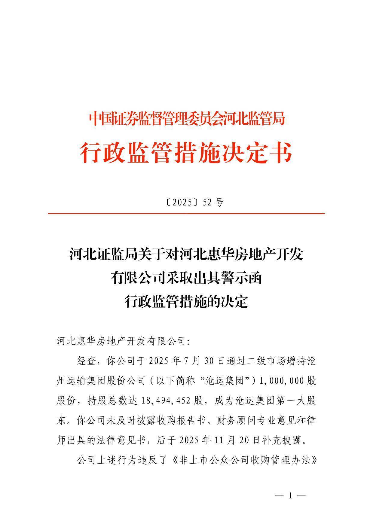 决定书指出,河北惠华房地产开发有限公司于 2025 年 7 月30 日通过二级市场增持沧州运输集团股份公司1,000,000股股份,持股总数达 18,494,452 股,成为沧运集团第一大股东。公司未及时披露收购报告书、财务顾问专业意见和律师出具的法律意见书,后于 2025 年11 月20 日补充披露。