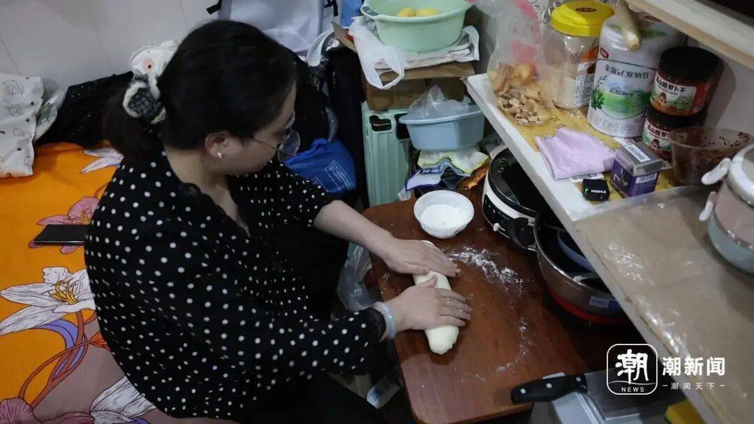 中午的主食是馒头,主菜是土豆炖牛肉。“我以前都不会做馒头,也是来了杭州之后学的。”张昕悦一边和着面,一面向长辈们询问技巧,从最后有一点点硬的成品来看,确实是个新手。